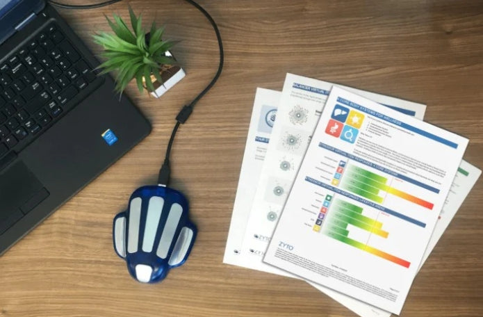 The ZYTO Hand Cradle sends gentle electrical signals through the skin and records how your body responds.